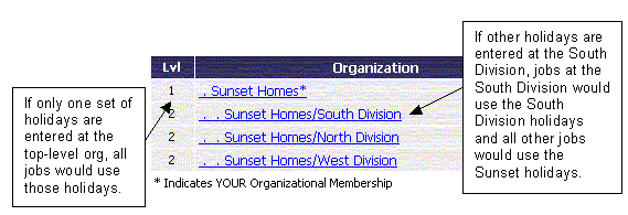 Each division within a company can record independent holidays on the Organization Detail page. This means that all jobs for that division, or organization, will use the new holidays.